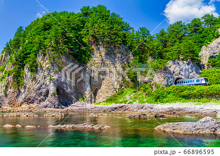トンネルから出る五能線のリゾート列車 リゾートしらかみ青池 青森県深浦町