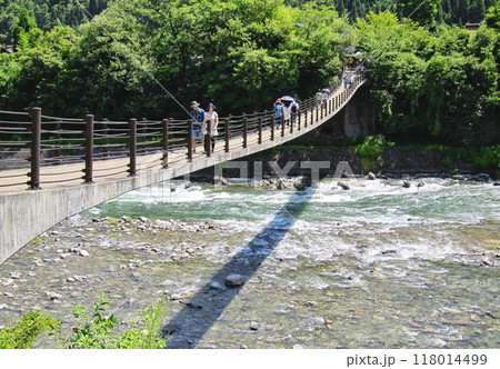 岐阜県 白川郷合掌造り集落 庄川に架かる、であい橋 世界遺産