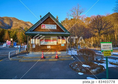 冬の朝の長野県駒ヶ根市にある菅の台バスセンター(バス、ロープウェイきっぷ売り場)