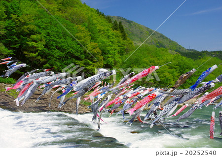 材木岩公園の噴水と鯉のぼり(宮城県白石市)