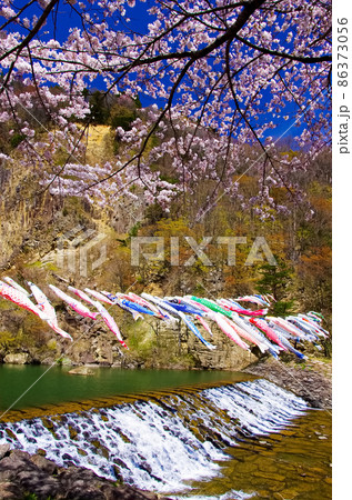 材木岩公園の桜と鯉のぼり(宮城県白石市)