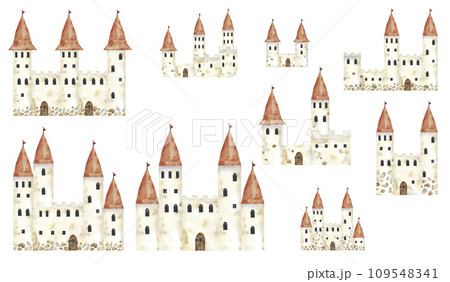 Set of medieval childish castle watercolor hand drawn illustration. Paint drawing fairy tail antique building with towers, flags, windows and gate isolated. Illustration on isolated white background.