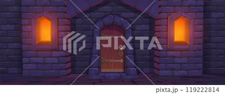 Vector interior of the dungeon with ancient stone columns and a door with glowing symbols