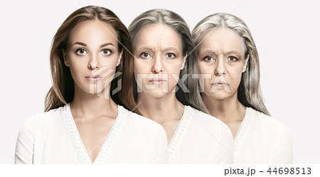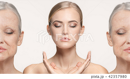 Comparison. Portrait of beautiful woman with young smooth and old wrinkled skin. Process of aging and rejuvenation