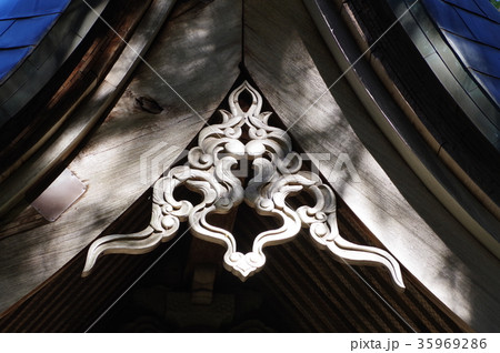 信州 木曽の文化財 熊野神社本殿 側面の懸魚 立川流斉藤常吉の建造による本堂は町文化財指定