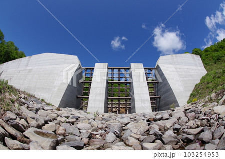 信州 小谷村の砂防施設 ガン沢砂防堰堤 朱色の大規模鋼製スリットが特徴的