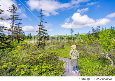 神仙沼湿原 遊歩道 木道 女性 トレッキング