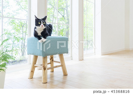Devon Rex cat perched on stool, indoor lifestyle portrait