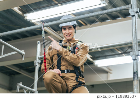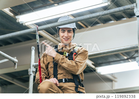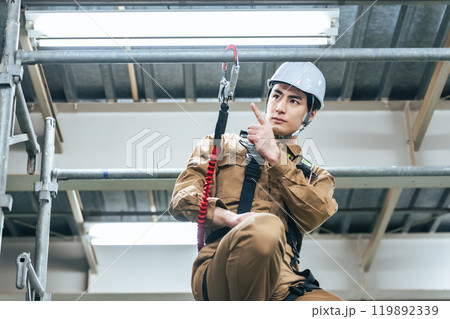 建設現場の足場に登って落下防止フックを確認する作業員
