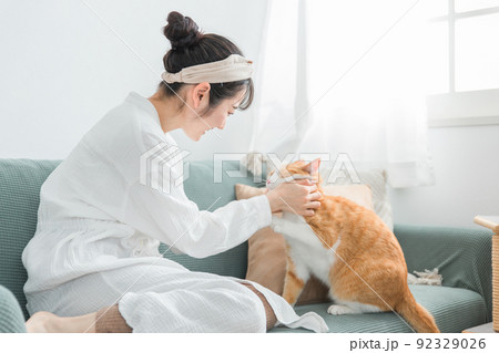 家で猫を抱っこする日本人女性(ペット・飼い主)