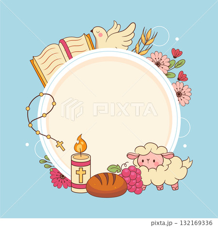Decorative religious frame with bible lamb dove and candle in cartoon style