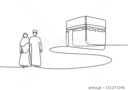Muslim Couple at the Kaaba for Hajj Pilgrimage Continuous Line Drawing Vector. Islamic Vector Art.