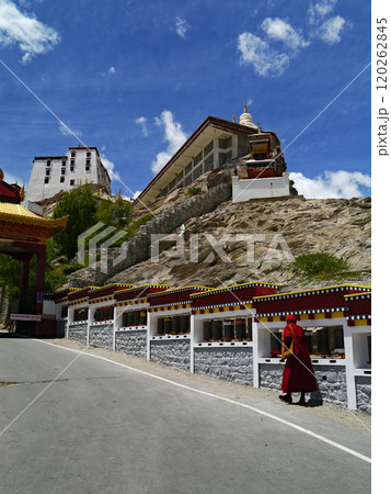 インド北部の小チベットといわれるラダック地方西部にあるティクセゴンパの参道を歩むチベットの僧侶