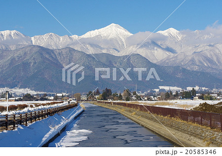 信州 冬の安曇野 常念岳と拾ヶ堰(じっかせぎ) 安曇野冬景色