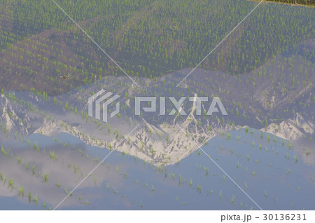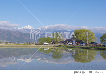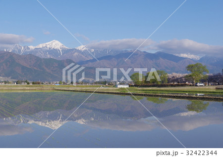 信州 安曇野 水田に映る北アルプス常念岳 ピラミッド型の端正な山容は安曇野のシンボル
