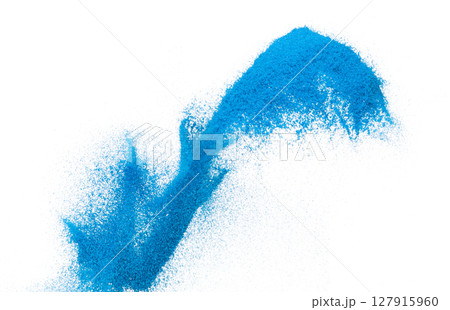 Small size blue Sand flying explosion, Ocean sands grain wave explode. Abstract cloud fly. Blue colored sand splash throwing in Air. White background Isolated high speed shutter, throwing freeze stop