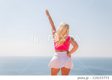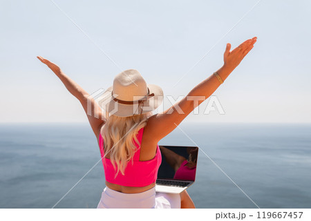 A woman wearing a pink top and hat is holding a laptop and looking out at the ocean. She is enjoying the view and the technology she is using.