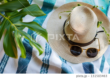 Straw Hat and Sunglasses on Beach Towel. Summer Vacation Essentials