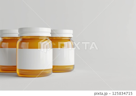 Glass jars sealed with gold, silver, bronze lids contain apricot jam. Watercolor illustration for template design of sweet harvest, summer fruits, juices, canned food, marmalade and sweets