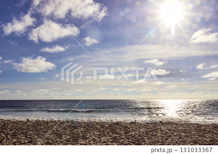 Sunny beach scene with blue sky, fluffy clouds, and sparkling ocean waves