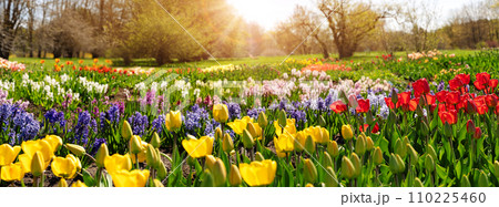 Natural park with young red and white tulips.