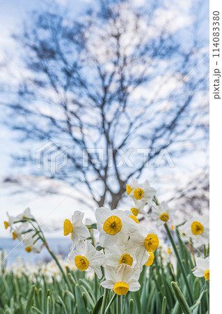 白い水仙と菜の花が満開の春の風景