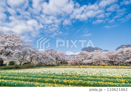 「山梨県」実相寺の桜と約8万本のラッパ水仙