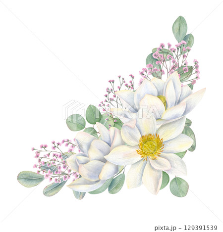 White lotus flower heads, pink gypsophila branch and eucalyptus leaves watercolor template on isolated background. Water lilies, baby breath plant, leaves illustration. For wedding invitation, cards.