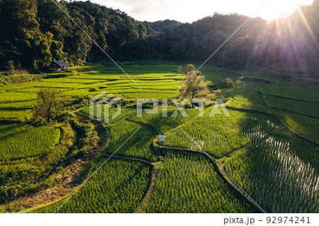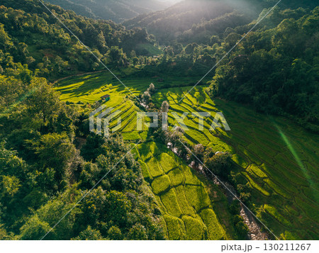 Aerial view of rice fields in the morning, green rice fields in rural Chiang Mai