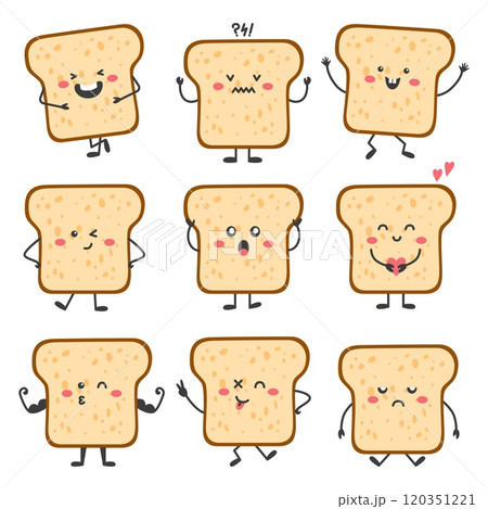 Bread slice character. Funny emotional toast in different poses. Cute cartoon childish mascot, kawaii breakfast element. Isolated food neoteric vector set