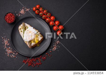 Delicious hearty breakfast consisting of poached eggs on toast with cream cheese, asparagus