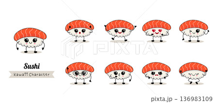 Set of cute cartoon colorful salmon sushi with different emotions.
