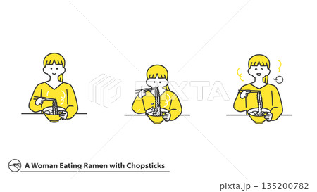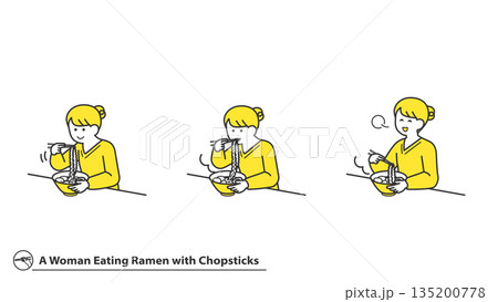 箸でラーメンを食べる女性 表情バリエーション セット 2色