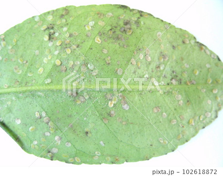 葉の裏に寄生し樹液を吸い、排泄物がスス病の発生原因になる害虫、ミカンコナジラミの幼虫の様子