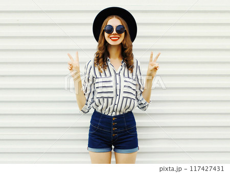 Happy smiling cool girl in black round hat, shorts, white striped shirt posing on white background
