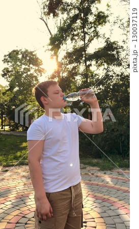 Thirsty after exercise, Cooling off in sunlight, Boy drinks and smiles, Fountain of youth, Natural refreshment, Routine hydration, Park and play, Sun setting behind, Active child, Pure water enjoyment