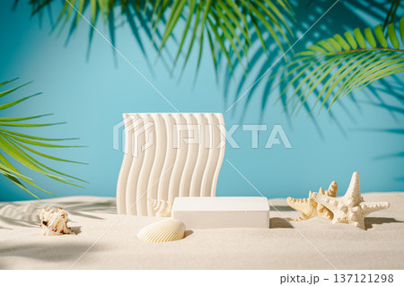 podiums on the sand for presentation show product cosmetic display , stage pedestal or platform background