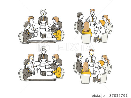真剣な様子の会議 コミカルな手書きの人物 ベクター、線画にシンプルな色つけ