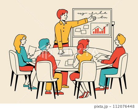 楽しそうな会議 コミカルな手書きの人物 ベクター、線画にシンプルな色つけ