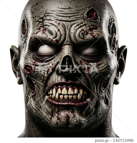 Detailed Portrait of a Grotesque Undead with Bloody Wounds and White Eyes on White Background