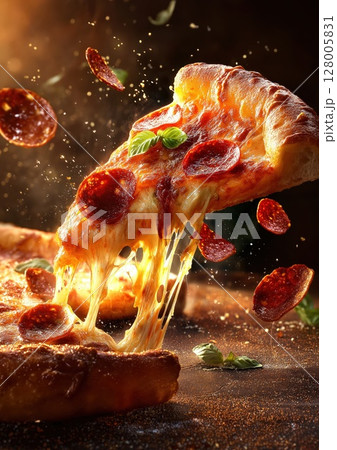 Juicy Pepperoni Pizza Slice with Stretching Cheese
