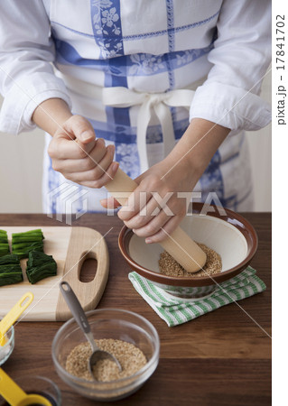 すり鉢で胡麻をする女性