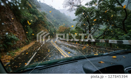 Rainy Autumn Road Through Lush Green Mountains