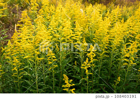 湖畔に咲くセイタカアワダチソウ 花の写真素材
