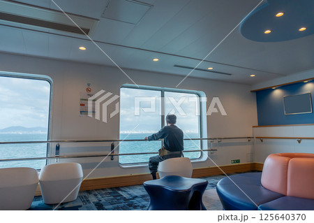 北九州市新門司港から神戸行きフェリーせっつの船内の展望ロビーで窓の外を眺めている男性
