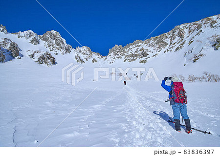 長野県駒ヶ根市の冬の千畳敷カールから中央アルプスホテル千畳敷方面を見る