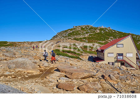長野県の秋の駒ヶ岳の山小屋(天狗荘)付近から中岳方面を眺める