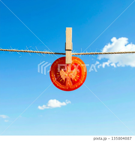 Tomato Slice Clipped to Clothesline Against Clear Sky