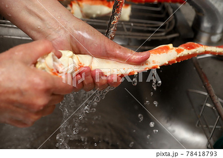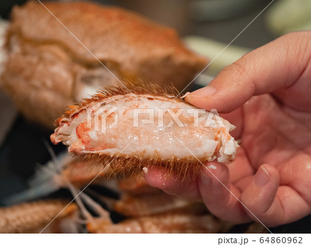 毛蟹の甲羅をあけて、蟹味噌を取り出す様子。