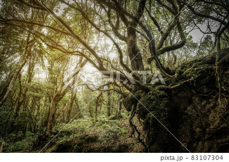 Mystic forest landscape, overgrown trees and roots, Tenerife
